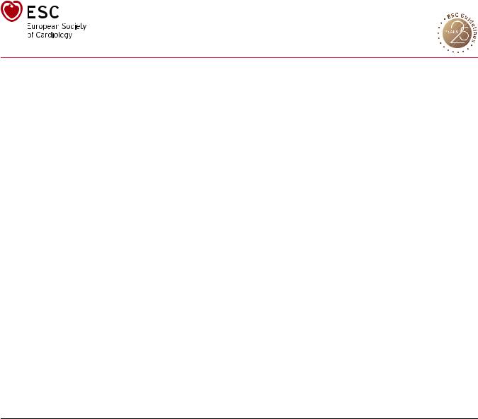 Disclaimer. The ESC Guidelines represent the views of the ESC and were produced after careful consideration of the scientific and medical knowledge, and the evidence available at the time of their publication. The ESC is not responsible in the event of any contradiction, discrepancy, and/or ambiguity between the ESC Guidelines and any other official recommendations or guidelines issued by the relevant public health authorities, in particular in relation to good use of healthcare or therapeutic strategies. Health professionals are encouraged to take the ESC Guidelines fully into account when exercising their clinical judgment, as well as in the determination and the implementation of preventive, diagnostic, or therapeutic medical strategies; however, the ESC Guidelines do not override, in any way whatsoever, the individual responsibility of health professionals to make appropriate and accurate decisions in consideration of each patient’s health condition and in consultation with that patient and, where appropriate and/or necessary, the patient’s caregiver. Nor do the ESC Guidelines exempt health professionals from taking into full and careful consideration the relevant official updated recommendations or guidelines issued by the competent public health authorities, in order to manage each patient’s case in light of the scientifically accepted data pursuant to their respective ethical and professional obligations. It is also the health professional’s responsibility to verify the applicable rules and regulations relating to drugs and medical devices at the time of prescription.