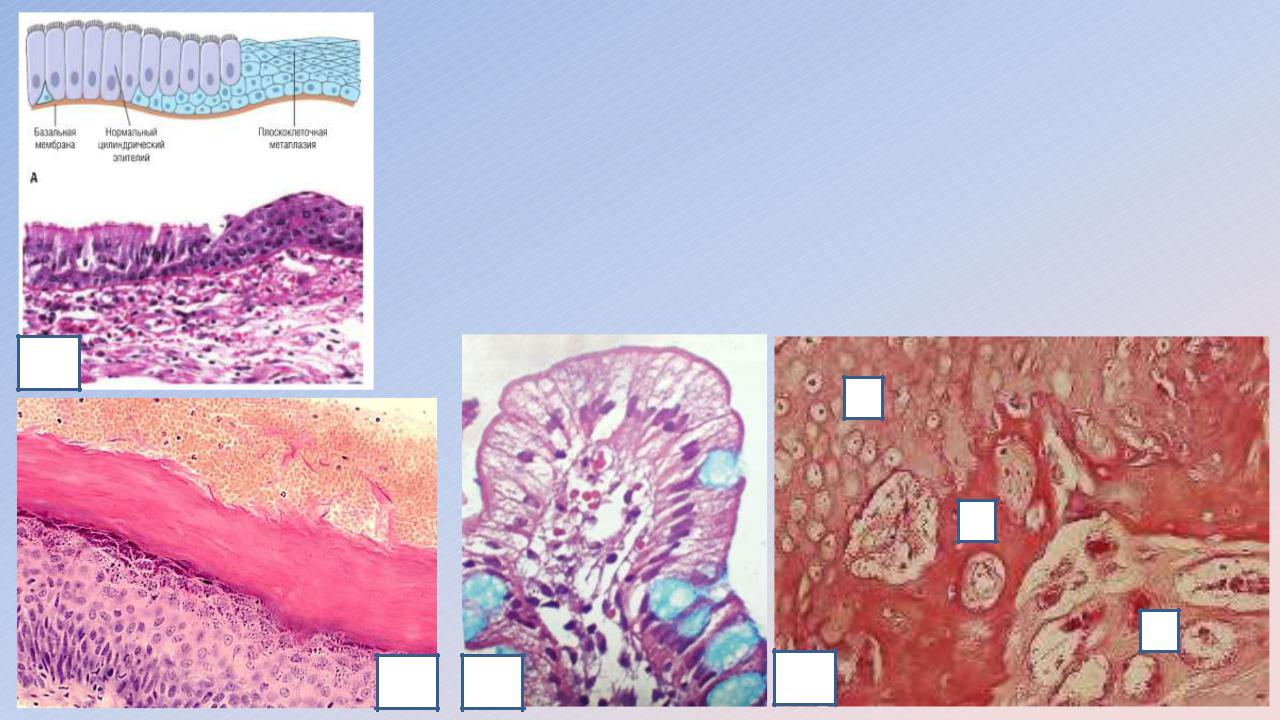 В эпителиальных тканях (замещение цилиндрического эпителия на многослойный плоский в стенке бронха – 1, замещение неороговевающего многослойного эпителия на ороговевающий в шейке матки – 2, замещение желудочного эпителия на кишечный в желудке - 3).