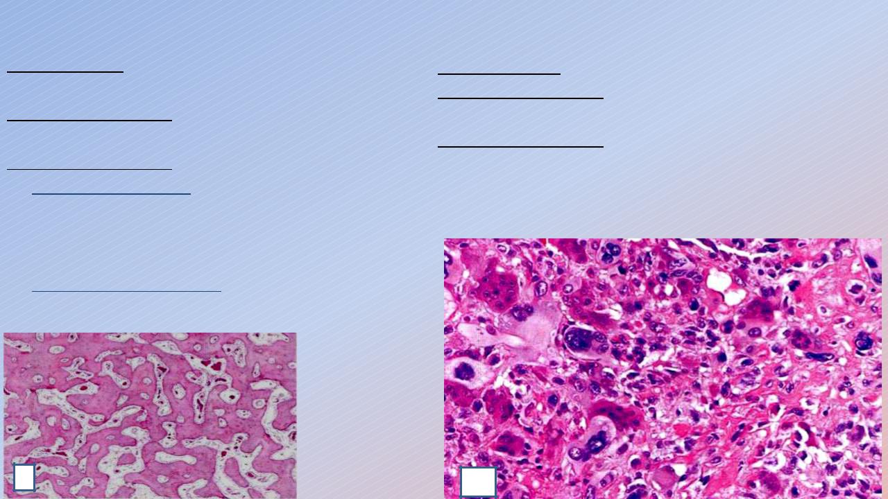 Локализация: та же, что и у остеомы. Макроскопически: образование без четких границ плотной консистенции серо-белого цвета. Микроскопически: состоит из беспорядочно расположенных недифференцированных остеобластных клеток (2).