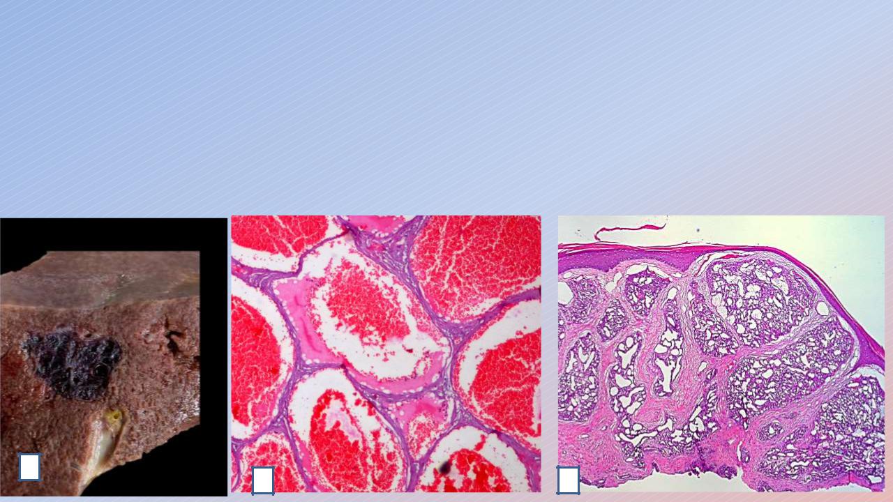 Микроскопически: состоит из сосудов кавернозного типа – кавернозная гемангиома (2), капиллярного типа (капиллярная - 3), венозного – венозная гемангиома.