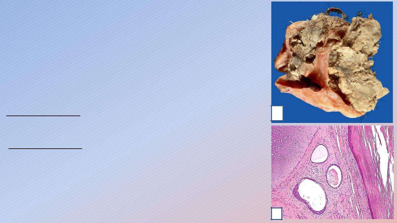 Макроскопически: солидный узел или киста, содержит волосы и придатки кожи (дермоидная киста - 1), а так же различные зрелые дифференцированные ткани, зубы.