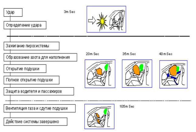 Воздушная подушка водителя имеет объём от 60 до 80 л, а переднего пассажира – до 130 л. Нетрудно представить, что при срабатывании системы объём салона уменьшается наД200–250 л в течение 0,04 с, что даёт немалую нагрузку на барабанные перепонки. Кроме того, вылетающая со скоростью более 300 км/ч подушка таит в себе немалую опасность для людей, если они не пристёгнуты ремнём безопасности и ничто не задерживает инерционное движение тела навстречу подушке.