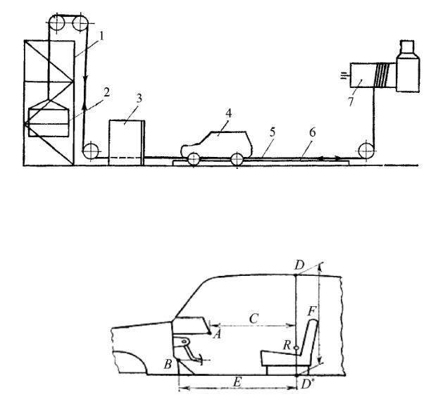 ветствующей положению центра шарнира тазобедренного сустава сидящего человека) до точки А (наиболее выступающей точки панели приборов), Е от точки R до точки В (находящейся на передней стенке кабины в плоскости, проходящей через середину тормозной педали) и F между точками D и D', расположенными на потолке и полу кузова на одной вертикали с точкой R. Расстояния С, Е и F не должны быть меньше некоторых