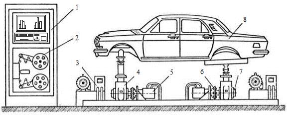 7 – контрольное устройство (датчик о ратной связи); 8 – испытываемый кузов |