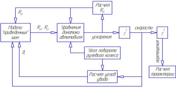 Математическая модель для имитационных исследований, базирующаяся на экспериментальных данных натурных испытаний, может обладать достаточной работоспособностью и точностью. Математическая модель описывает «одноколейный» автомобиль с характеристиками «приведенных» шин, включающими в себя динамические параметры реальных шин, системы подрессоривания, кузова и трансмиссии. Модель автомобиля, эквивалентного исследуемому, имеет пять степеняей свободы. Принципиальная схема расчета параметров криволинейного движения автомобиля представлена на рис. 33.