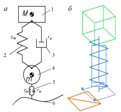 Рис. 34. Модель стойки АТС со стандартной структурой модели амортизатора: а – структура модели; б – модель в системе моделирования FRUND;