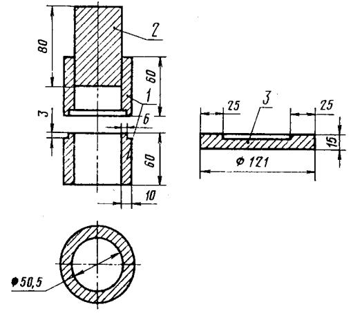Рис. 11.1. Форма для уплотнения порошка: 1 – полый разъемный цилиндр, 2 – вкладыш, 3 – металлический поддон