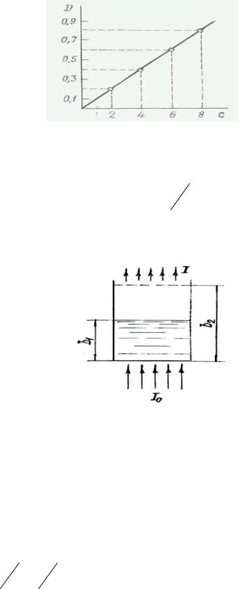Уравнение (4.6) является математическим выражением закона Бугера– Ламберта–Бера (основного закона колориметрии): оптическая плотность растворов при прочих равных условиях прямо пропорциональна концентрации растворенного вещества и толщине поглощающего слоя раствора (рис. 4.3).