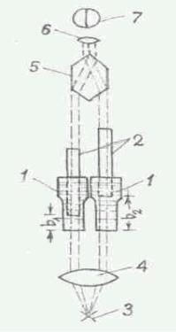 Рис. 4.5. Принципиальная схема колориметра погружения: 1 – кюветы; 2 – стеклянные стержни, погружаемые в кюветы с окрашенными растворами; 3 – лампа; 4 – линза-конденсор; 5 – стеклянная призма; 6 – линза окуляра; 7 – световое пятно, видимое в окуляр и разделенное на две половины с выравниваемой интенсивностью окраски