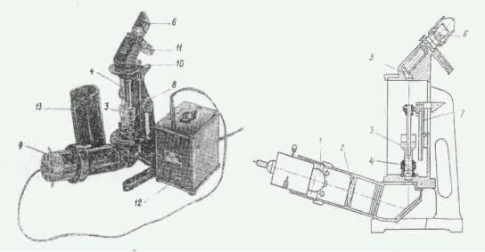 – отсчетная шкала; 8 – маховик перемещения погружателя; 9 – патрон лампы; 10 – луч нониуса отсчетной шкалы; 11 – диск светофильтров; 12 – трансформатор; 13 – кожух