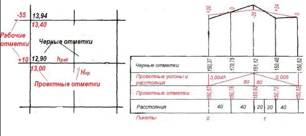 - черные отметки, относящиеся к естественной поверхности; - красные или проектные отметки, относящиеся к проектной