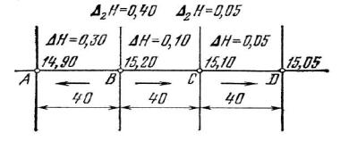 НВ=52,38 +16 · 0,006 =53,34; НС= 52,38 – 30 · 0,01 =52,08; HD=53,34 – 30 · 0,01 =53,04.