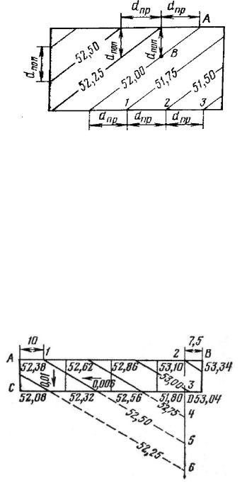 ризонтали 52,50 и 52,25. Из условия задачи следует, что заложения dпр и dпоп, соответствующие продольному и поперечному уклонам плоскости, также известны. Тогда горизонталь 52,00 должна пройти через точки А и В, которые определяются так, как показано на рис. 5.11.