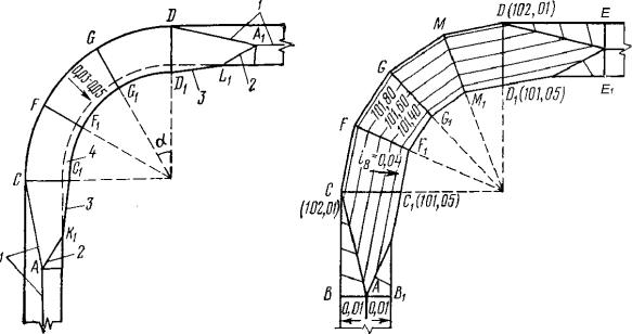 Пр мер. Заданный поперечный уклон РД inonРД = 0,01; ширина РД bРД = 21 м; уклон виража iB = 0,04; величина уширения РД на повороте Δ=3,5 м; рад ус закругления РД по ее внутренней кромке R = 40 м; проектная отметка поверхности покрытия НВ=НВ1=100,90.