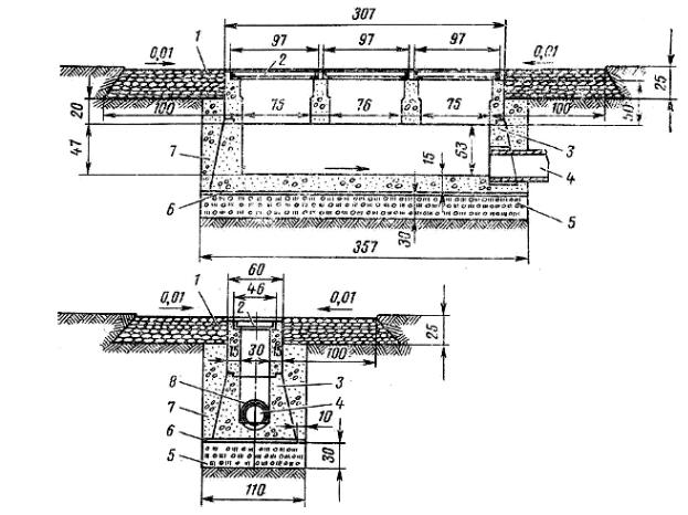 1 – щебеночная отмостка с пропиткой битумом на 6–8 см; 2 – решетка; 3 – стенки колодца; 4 – перепуск; 5 – шлаковая подушка;