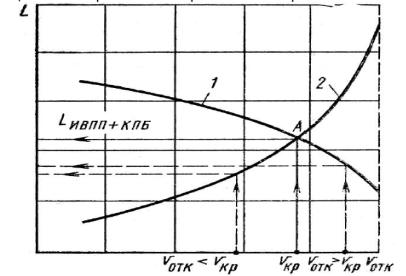 Из анализа формул (2.6) и (2.7), а также из рассмотрения на рис. 2.2 кривых 1 к 2, построенных по этим формулам, следует, что суммарная длина ИВПП+КПБ с увеличениемИскорости Vотр уменьшается в случае продолженного взлета и увеличивается в случае прерванного взлета. Очевидно, оптимальным будет такое значение Voтк, при котором суммарная длина ИВПП+КПБ оказывается минимальной и одновременно обеспечивается безопасность взлета и посадки самолетов. Этому условию удовлетворяет скорость отказа двигателя, соответствующая точке пересечения А кривых 1 и 2 на рис. 2.2 [6].