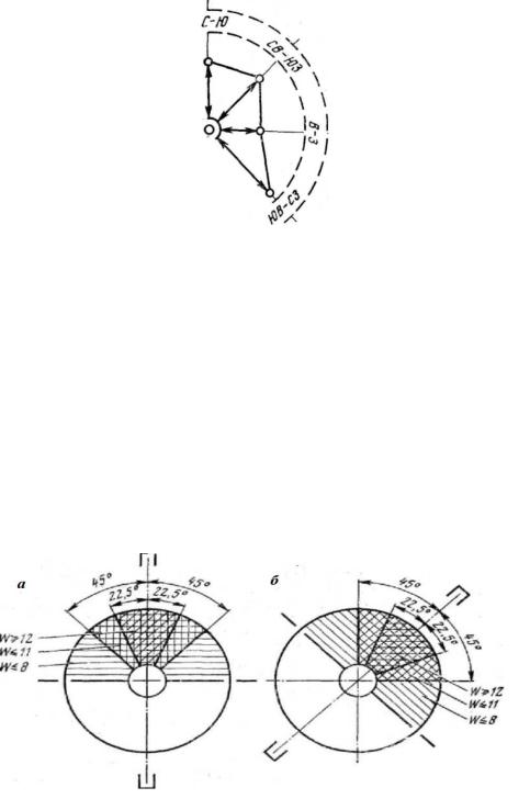Выделенная часть расчетной схемы (внутри жирной линии), в пределах которой суммируются значения повторяемости ветров, получена с учетом графиков охвата ветров (см. рис. 3.4) и приведена в качестве примера на рис. 3.5 для совмещенного направления С–Ю. Если необходимо получить выделенную часть расчетной схемы, например для совмещенного направления 10°–190°, то нужно повернуть выделенную часть для направления С–Ю (0°–180°) на 10° по часовой