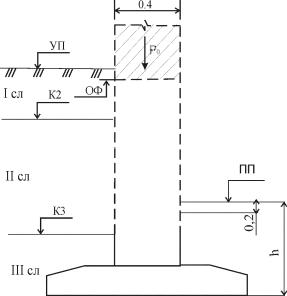 Рис.5. Грунтовая колонка и схема фундамента. Отметки: УП – уровня планировки; ОФ – обреза фундамента;
