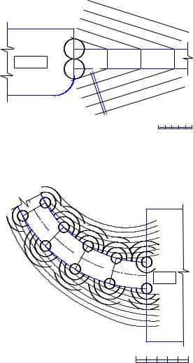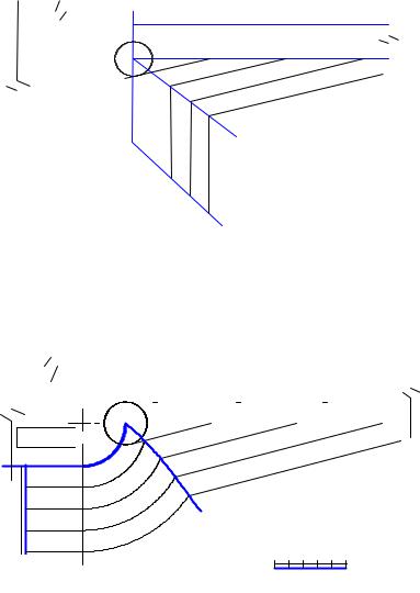 Проектные горизонтали съездов (рис. 23, 24) вычерчиваются перпендикулярно оси съезда с соответствующим интервалом, указанным на рис. 20. Для криволинейного съезда величина интервала отмеряется по оси съезда, а направление горизонталей радиальное. На откосах съездов проектные горизонтали не параллельны контуру съездов, а будут расположены касательно к горизонталям вспомогательных конусов с вершинами в точке пересечения линии контура съезда с контуром площадки. Уклон образующих этих конусов будет равен уклону откосов съезда. Горизонтали вспомогательных конусов это окружности радиусом, равным величине, кратной интервалу. Для их вычерчивания исполь-