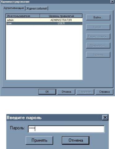 47.Войти в систему модулья Docs. Для этого необходимо выбрать пункт «Администрирование» в меню. После этого появится диалоговое окно, в котором нужно указать имя пользователя (admin или user) и нажать на кнопку «Войти» (рис. 74). Затем появится еще одно окно, в котором надо ввести выбранный перед этим пароль и нажать на кнопку «Принять» (рис. 75).