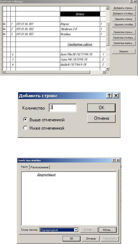). Необходимо щелкнуть ЛКМ в таблице спецификации, после чего в окне «Модификация таблицы» нажать кнопку «Свойства». Затем в появившемся окне «Свойства таблицы» (рис. 78), во-первых, добавим три строчки над словом «Детали». Для этого с помощью курсора мыши надо указать строчку, которая будет яв-