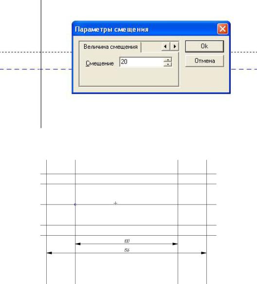 Смещение. Отметить горизонтальную линию и сместить указатель несколько выше ее. При этом штриховая линия, параллельная исходной, будет перемещаться вслед за указателем. Нажать клавишу «Пробел». В появившемся диалоговом окне (рис. 84,а) выбрать вкладку «Величина смещения». Ввести значение расстояния между линиями (радиус вала 20) и нажать кнопку «Ок».