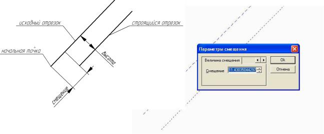При выборе вкладки «Относительно начальной точки» следует ввести значения смещения и высоты. В данном случае смещение – расстояние начальной точки строящейся линии и начальной точки исходной, высота – расстояние между линиями.