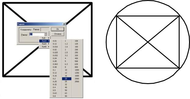 Для построения окружности следует указать ее центр (щелчок ЛКМ), затем нажать на клавишу «Пробел». На экране появляется диалоговое окно «Радиус», в котором нужно выбрать соответствующую вкладку и ввести значение радиуса либо с клавиатуры, либо щелчком ПКМ на поле ввода вызвать список нормальных рядов, из которых выбрать нужный (рис. 10). В результате будет построена фигура, представленная на рис. 11.