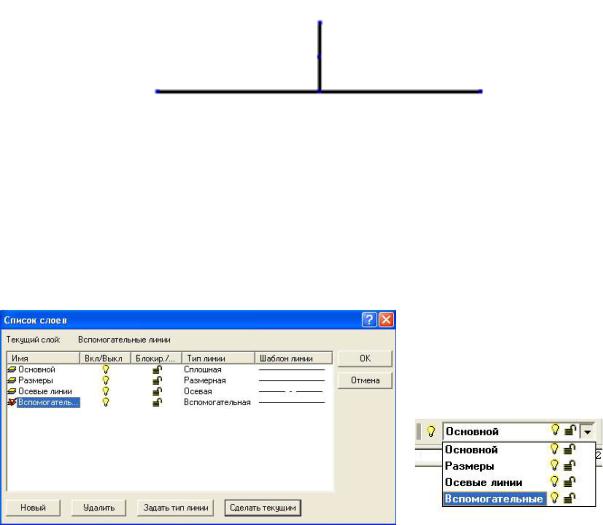 ). В появившемся окне «Список слоев» (рис. 16,а) необходимо указать слово «Вспомогательный» и нажать на кнопку «Сделать текущим». Завершить операцию кнопкой «OK». Другой способ сделать слой рабочим заключается в выборе слоя в списке (рис. 16,б).