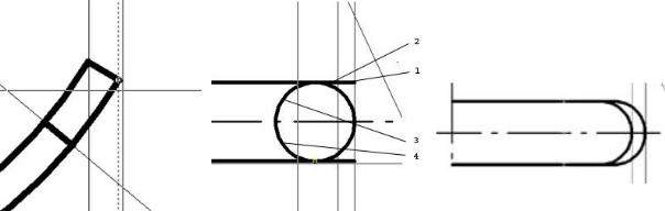 При этом следует помнить, что такое построение будет неточным и допустимо только при больших радиусах дуг. Сначала построить вид сверху, а затем, используя вспомогательные линии, построить след отверстия на виде спереди. В данном примере для наглядности будем использовать второй способ, описанный ниже.