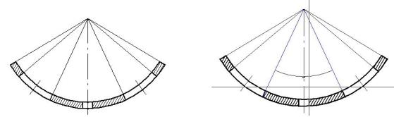 21.Простановка размеров дуг. Перед простановкой размеров необходимо сделать рабочим слой «Размеры». Соединить линиями центр дуг с точками, определяющими размеры дуг, как показано на рис. 26, а.
