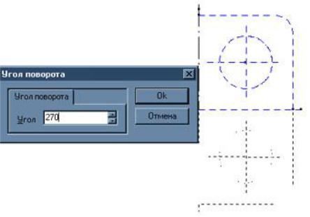 ). Как и при построении симметрии (см. п. 12), некоторые элементы чертежа нужно выделить (использовать второй способ). Потом курсором мыши указать начальную точку вращения (начало координат). Далее задать угол поворота (270 ) в диалоговом окне, появившемся после нажатия клавиши «Пробел» (рис. 35). Затем появится панель, в которой будет задан вопрос: «Удалить старые объекты?» − на что ответить «Нет». Завершить операцию кнопкой «OK». Аналогично создать вращение вокруг вертикальной оси (угол поворота 180 ) (рис. 36).