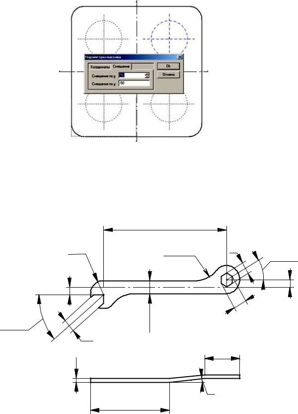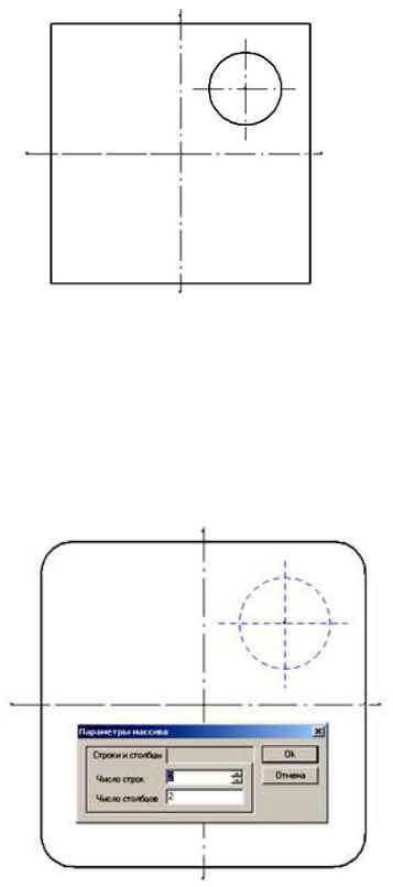 ). Вначале необходимо выделить окружность и ее оси. После чего появится диалоговое окно, в котором указать число строк и столбцов: 2 (рис. 44). Далее курсором мыши указать базовую точку (начало координат) перемещения. Конечную точку перемещения (- 50; -50) ввести в диалоговом окне, появившмся после нажатия клавиши «Пробел». Завершить операцию кнопкой «OK» (рис. 45).