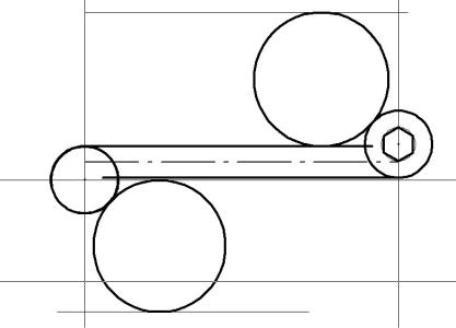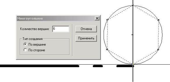 ). В появившемся диалоговом окне «Многоугольник» ввести количество вершин − 6. Тип создания должен быть установлен «По вершине». Указателем пометить центр вспомогательной окружности. Перемещая указатель мыши, совместить одну из вершин штрихового шестигранника с точкой пересечения вспомогательных окружности и вертикальной линии. В момент появления в этой точке синего индикатора привязки сделать щелчок ЛКМ.