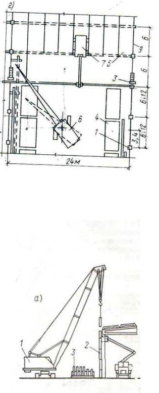 1 – колонна; 2 – стропильная ферма; 3- площадка лестница (приставная); 4- штабель плит покрытия; 5- смонтированное покрытие; 6- кран; 7- крышевой кондуктор для временного крепления фермы; 8 – кассета; 9 –временное ограждение.