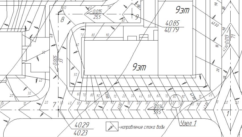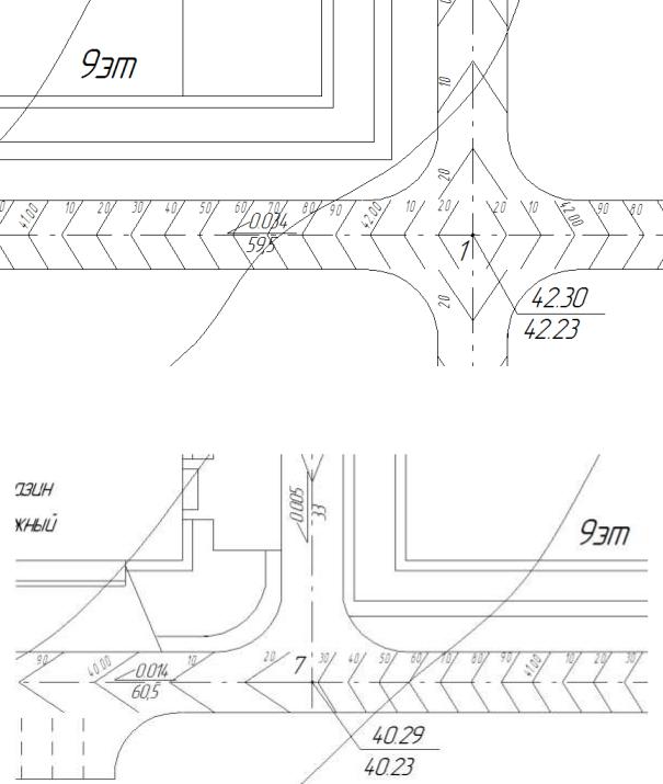 5. Производим графическую отрисовку горизонталей с учетом продольного iкр и поперечного iпопер уклонов (рис. П.6.6, П.6.7), отрисовку горизонталей на перекрестках и переломных точках местности выполняем по наилучшему стоку воды.
