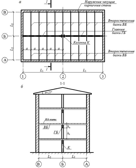 L1 х L2 – размеры ячейки балочной клетки перекрытия по внутренним граням стен: L1 – вдоль главных и L2 – вдоль второстепенных балок,м.