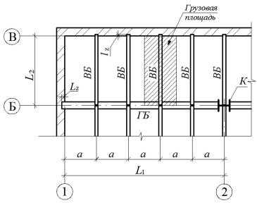 СНа рис. 2 приведен фрагмент плана здания для назначения шага второстепенных балок и их грузовой площади.