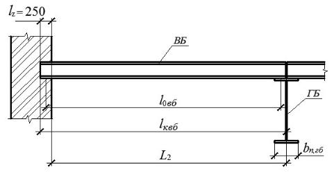 бина заделки второстепенной балки в стену; l0вб – расчётная длина второстепенной балки; lквб – конструктивная длина второстепенной балки; bп,гб – ширина полки главной балки, для предварительных расчетов принимается равной 400 мм.