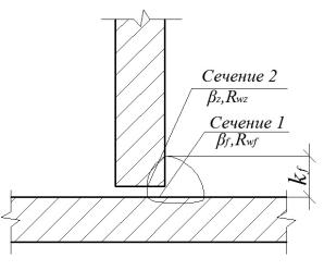 где βf и βz – коэффициенты, учитывающие вид сварки [1, табл. 39]; Rwf – расчетное сопротивление угловых швов срезу по металлу шва,