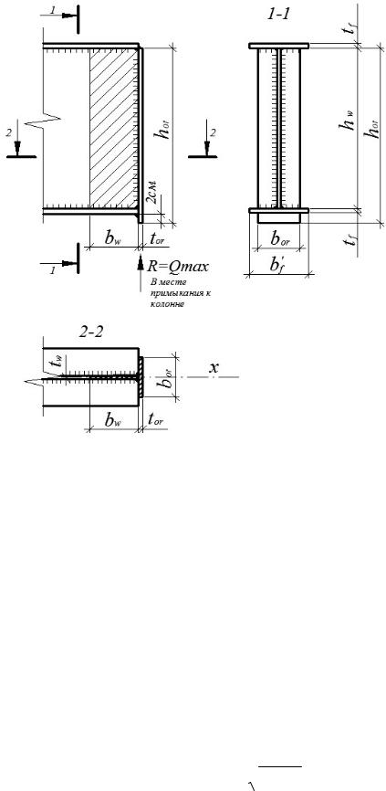 Принятое сечение опорного ребра балки проверяется на устойчивость относительно оси х как условного опорного стержня. В расчетное сечение этого стержня следует включать сечение опорного ребра и полосы стенки шириной bw = 0,65tw