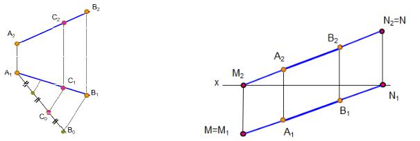 Одноименные проекции следов совпадают с самими следами. Для построения горизонтального следа прямой фронтальную проекцию прямой А2В2 продолжают до пересечения с осью х и получают фронтальную проекцию горизонтального следа М2. Так как точка М принадлежит прямой АВ, то ее горизонтальная проекция М1 находится на горизонтальной проекции прямой А1В1 и лежит на одной линии связи с проекцией М2. Для построения фронтального следа прямой его горизонтальную проекцию А1В1 продолжают до пересечения с осью х и получают горизонтальную проекцию фронтального следа N1. Фронтальную проекцию фронтального следа N2 прямой находят по линии связи на ее фронтальной проекции.