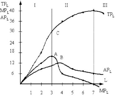 Конфигурация кривой среднего продукта АР также обусловлена динамикой кривой МР. На этапе I обе кривые растут, пока приращение объема выпуска от вновь нанятых рабочих будет большим, чем средняя производительность АРL ранее нанятых рабочих. Но после точки А (max MP), когда четвертый рабочий добавляет к совокупному продукту ТР меньше, чем третий, МР уменьшается, поэтому средняя выработка четырех рабочих также сокращается.