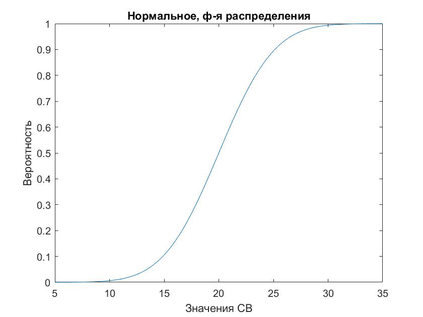 F=normcdf(x, Mx, sigma); figure(2) plot(x,F) xlabel('Значения СВ') ylabel('Вероятность')