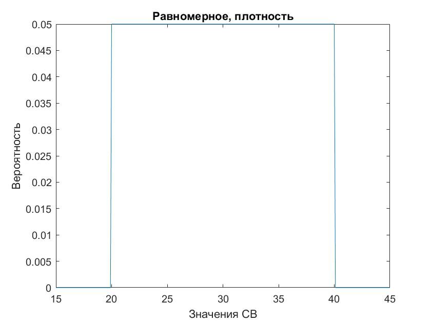% равномерное a=20; b=40; x=15:0.1:45; f=unifpdf(x, a, b); figure(3) plot(x,f) xlabel('Значения СВ') ylabel('Вероятность')