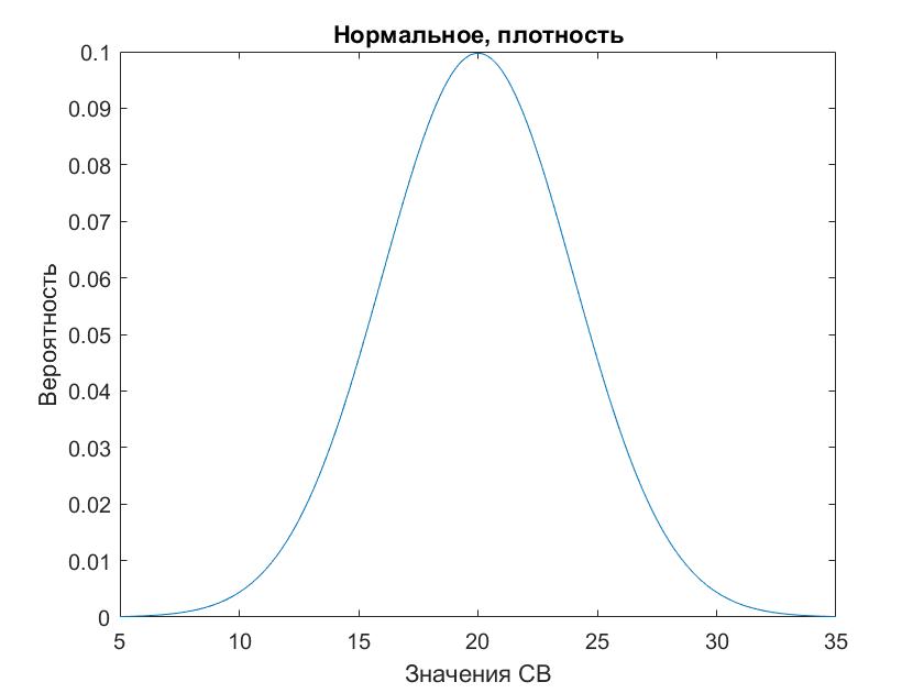 % нормальное Mx=20; sigma=4,47; x=5:0.1:35; f=normpdf(x, Mx, sigma); figure(1) plot(x,f) xlabel('Значения СВ') ylabel('Вероятность')