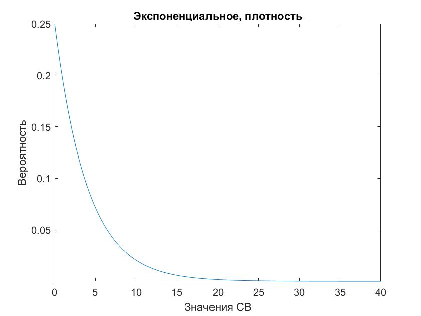 %экспоненциальное x=0:0.1:40; lambda=4 F=exppdf(x,lambda); figure(5) plot(x,F) xlim([0,1]) xlabel('Значения СВ') ylabel('Вероятность')