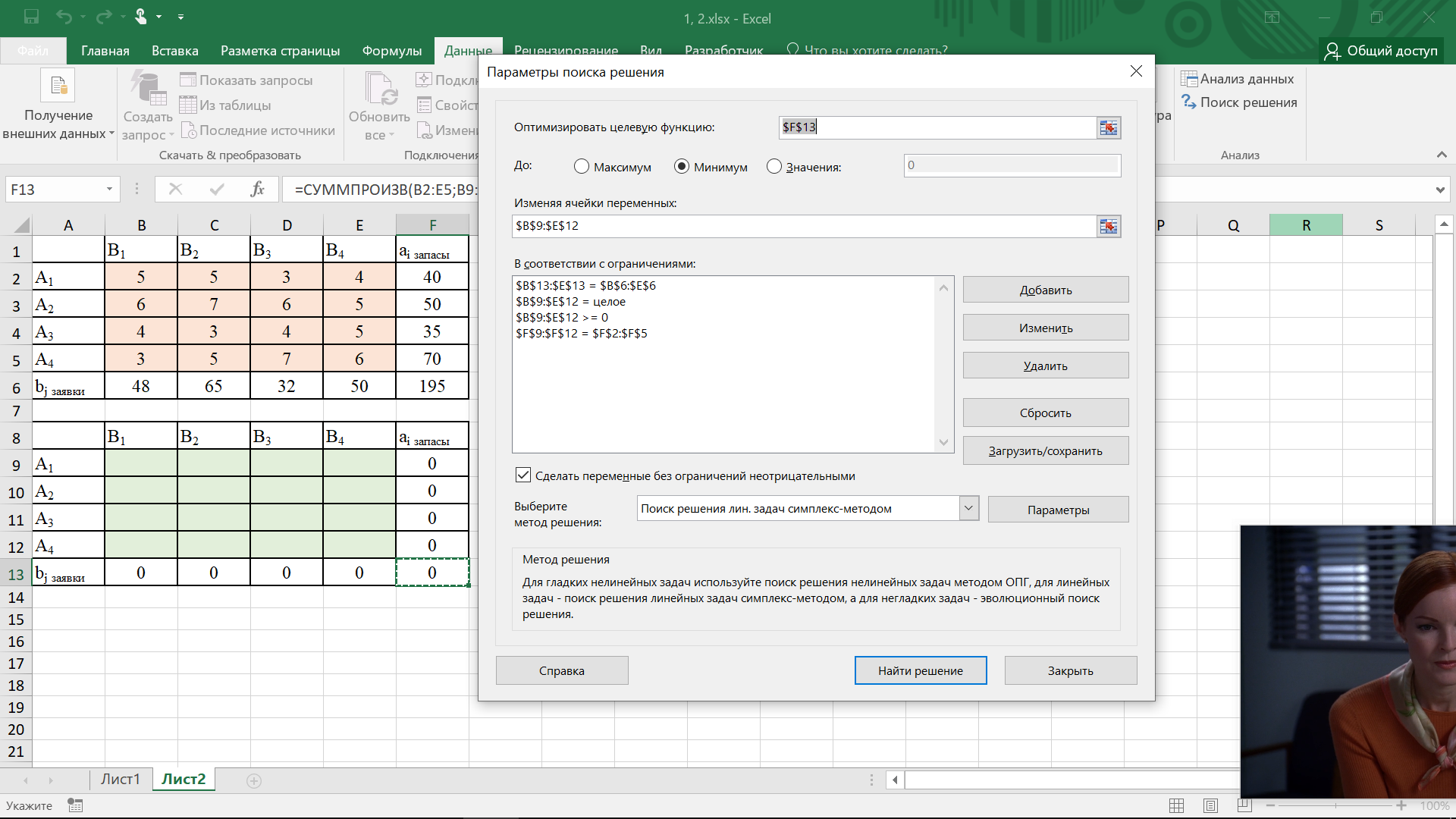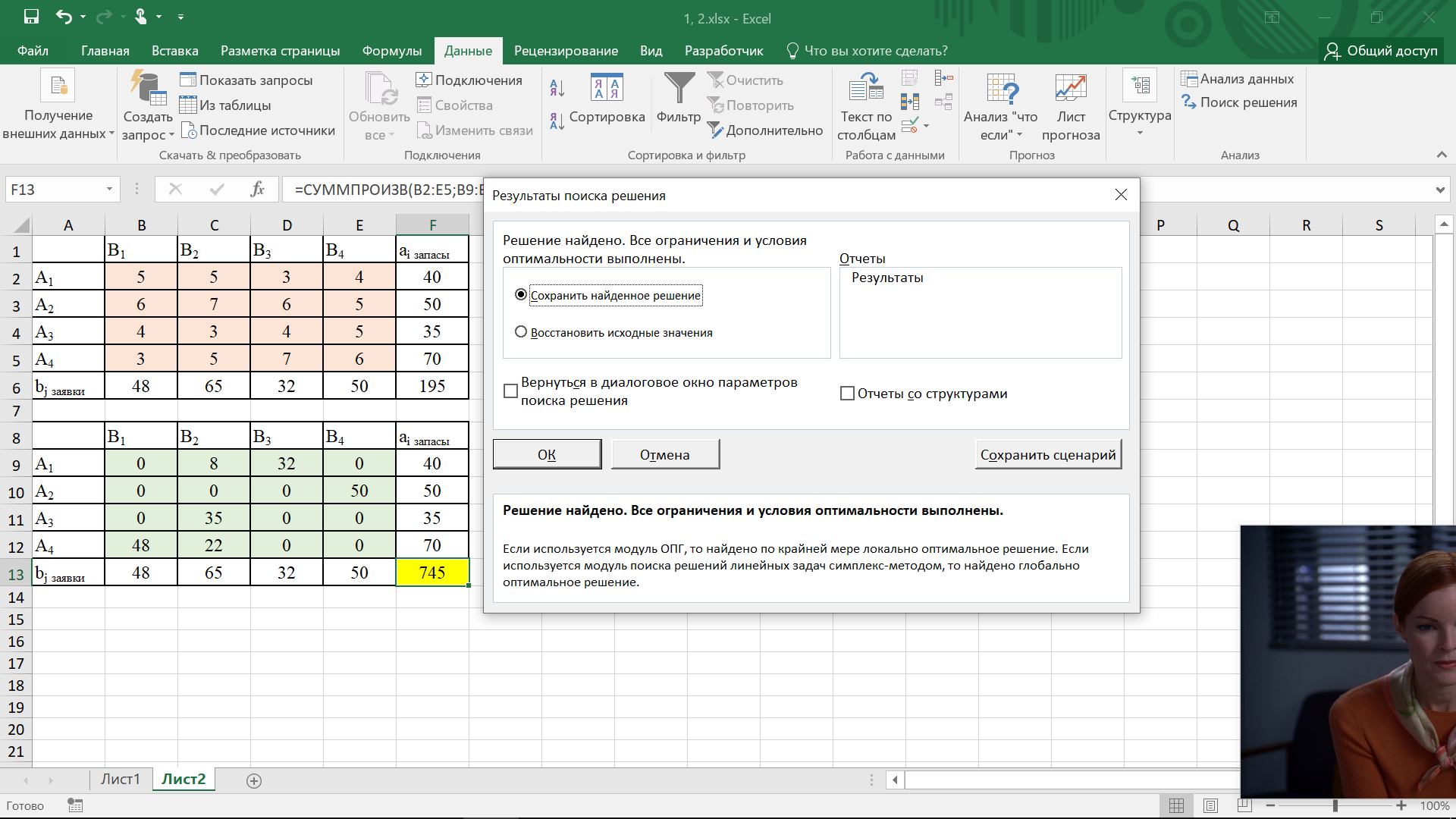 Был создан файл excel с двумя таблицами. Первая таблица была заполнена исходными данными, во второй таблице введены формулы суммы по строкам и столбцам. В строке F13 формула =СУММПРОИЗВ(B2:E5;B9:E12) (сумма значений произведения соответствующих ячеек из первой и второй таблицы). Для решения данной задачи был использован Поиск решений. Все данные были введены и представлены на рисунке 1. Далее был произведен поиск решения, появившееся окно на рисунке 2 информирует о том, что решение было найдено, оно также представлено на рисунке 2. В желтой ячейке представлено минимально возможное значение общих затрат на транспортировку (L = 745).