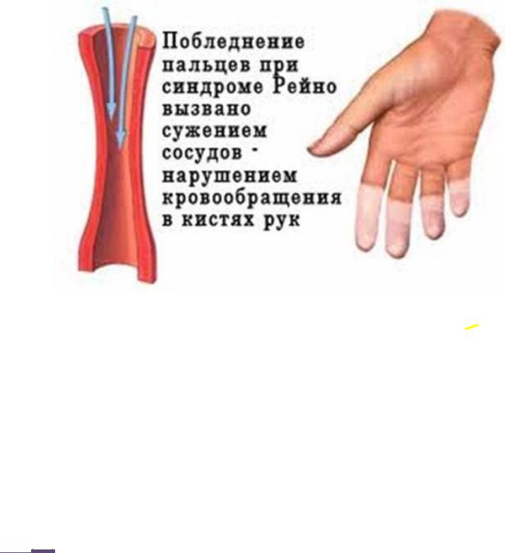 действию холода. В качестве причины развития феномена Рейно у рабочих, подвергавшихся воздействию вибрации, рассматривают усиленный под длительным действием вредной вибрации центральный сосудосуживающий рефлекс, а также локальные изменения в сосудах пальцев, что графически представлено на рис. 7.2. Синдром белых пальцев − профессиональное заболевание, признанное во многих странах.