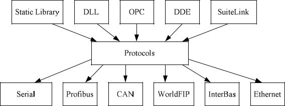 На рис. 7 показаны программные интерфейсы для Windowsприложений (в том числе и SCADA-систем) и спектр широко распространенных промышленных протоколов. Использование этих протоколов позволяет организовать взаимодействие с контроллерами, устройствами, объединенными промышленными (fieldbuses) и обычными сетями. Предлагаемая схема решения позволяет конечному пользователю, системному интегратору, единообразным способом организовать взаи-